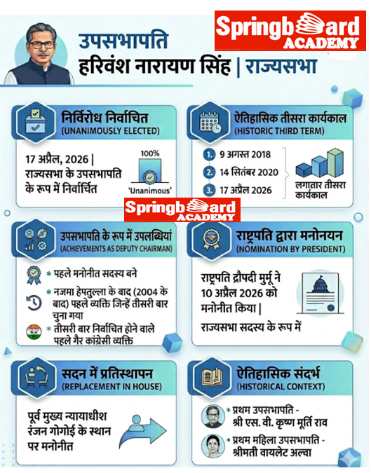 17 अप्रैल, 2026 को राज्यसभा के उपसभापति के रूप में हरिवंश नारायण सिंह निर्विरोध निर्वाचित हुए हैं।