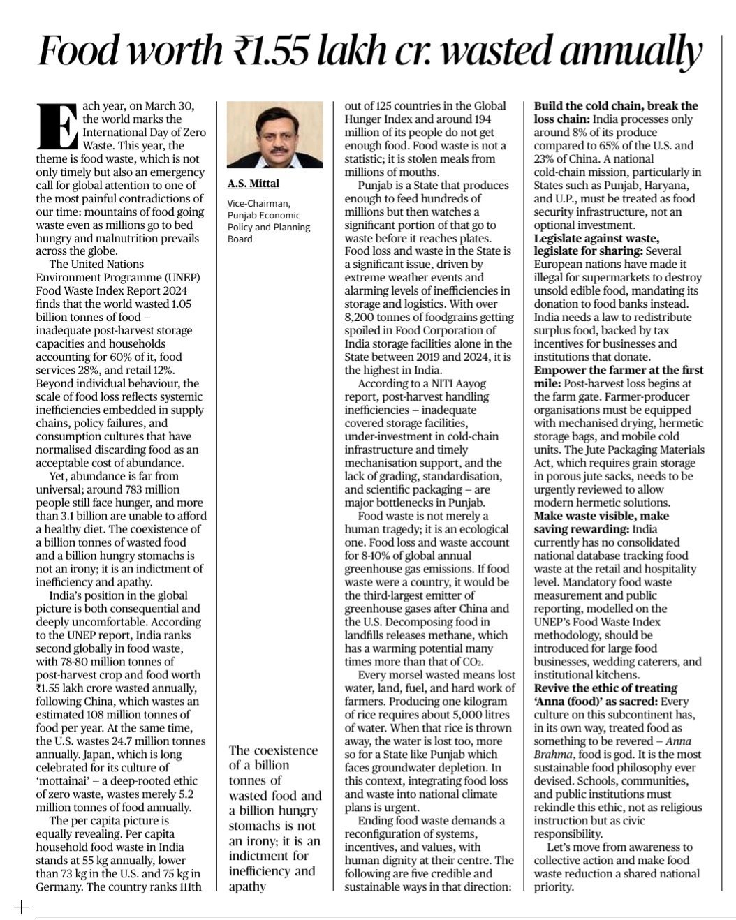 Food waste has emerged as a major global concern, highlighted every year on 30 March (International Day of Zero Waste). In India, the issue is particularly alarming—while millions suffer from hunger and malnutrition, a massive quantity of food is wasted annually. This reflects a serious imbalance in food distribution, infrastructure, and consumption patterns.