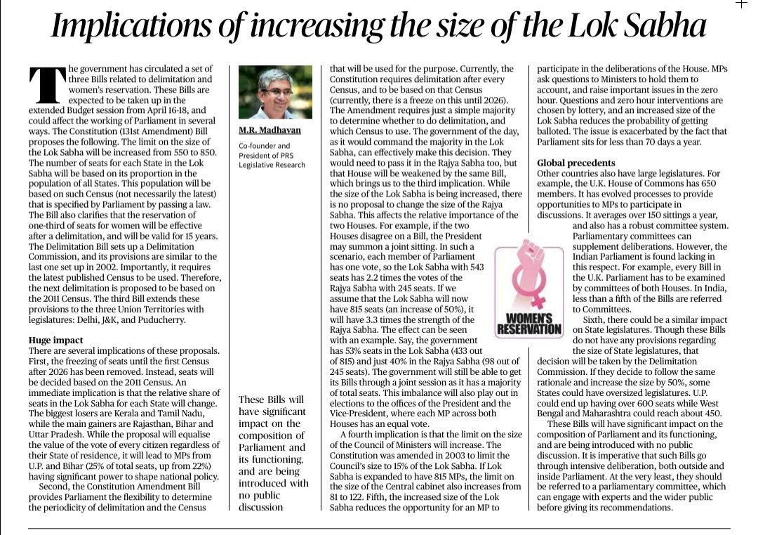 Increasing the size of the Lok Sabha is a major structural reform that can reshape India’s political and parliamentary landscape. While it improves representation, it also raises concerns about federal balance and legislative efficiency. A balanced and transparent implementation is essential to ensure that democracy becomes more representative without compromising governance quality.