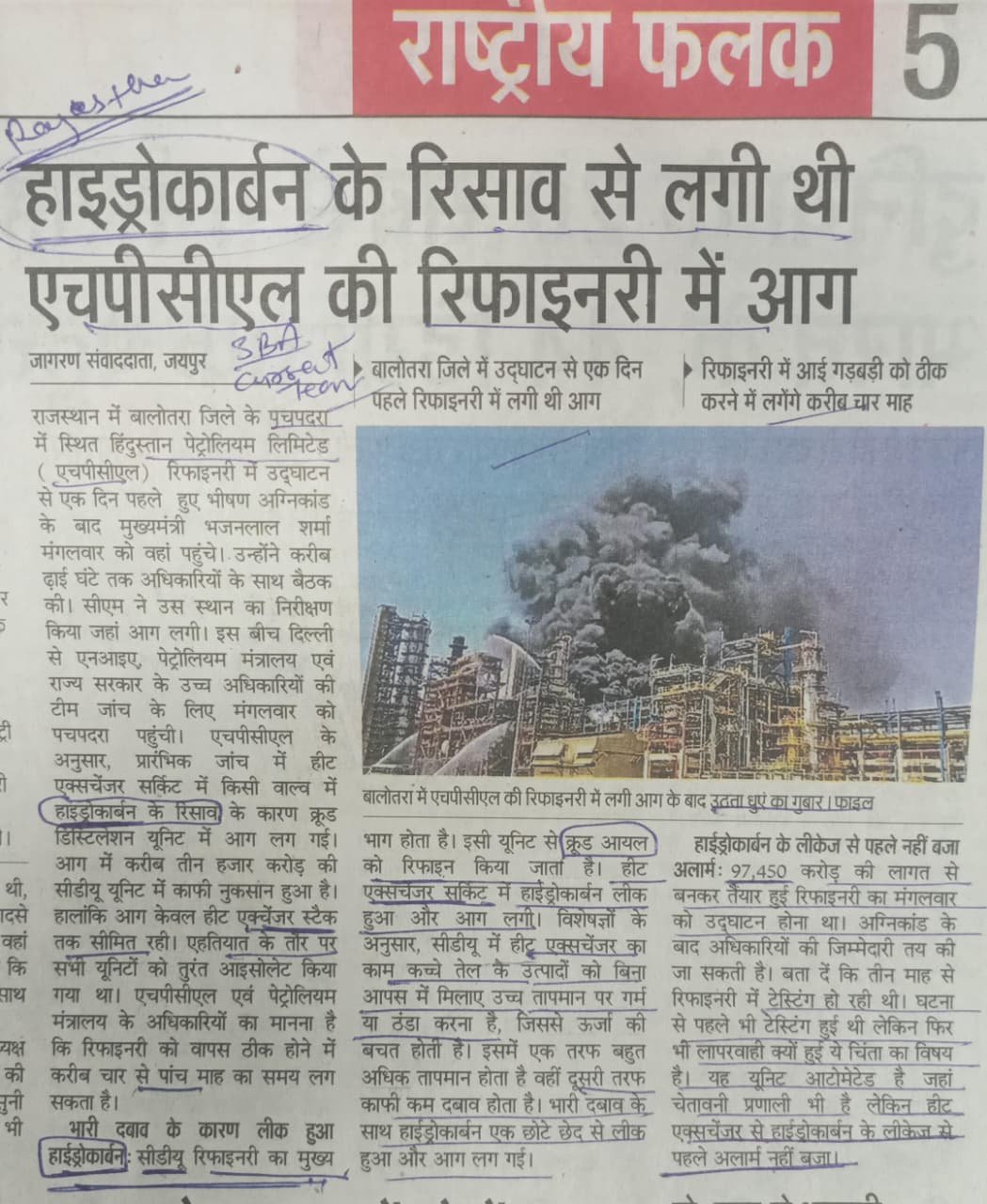 - - राजस्थान के पचपदरा (बाड़मेर) स्थित रिफाइनरी परियोजना में दुर्घटना ने औद्योगिक सुरक्षा पर प्रश्न खड़े किए।