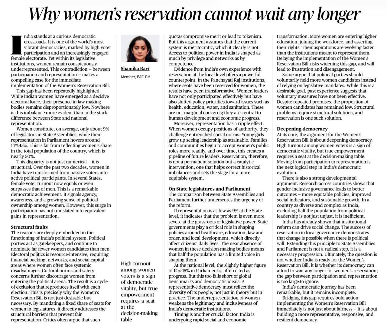 - Women’s reservation is not merely an issue of fairness but a necessity for deepening democracy. India’s democratic journey will remain incomplete unless women are adequately represented in State Assemblies and Parliament.