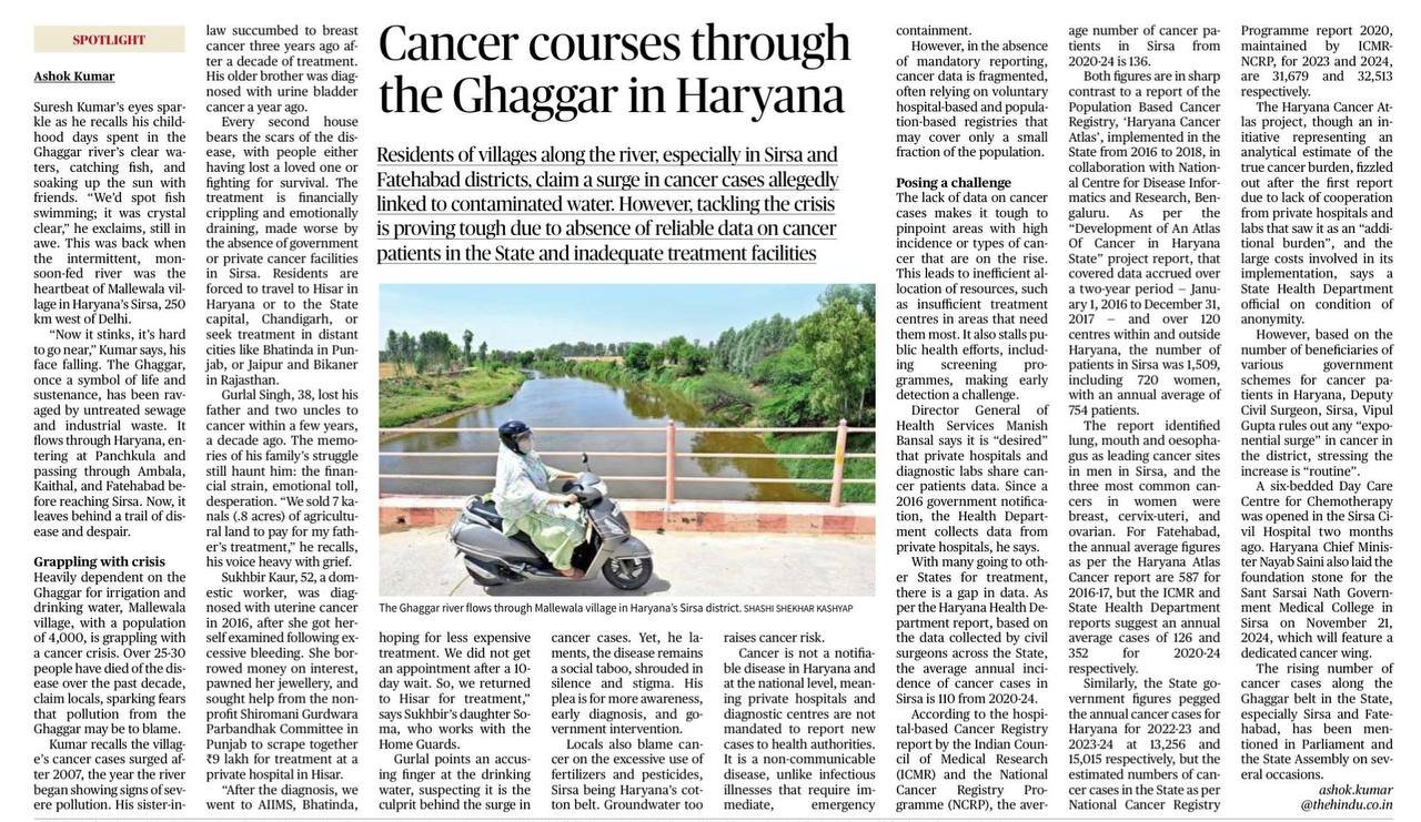 - Villages along the Ghaggar River in Haryana—particularly Sirsa and Fatehabad—are witnessing a concerning rise in cancer cases.