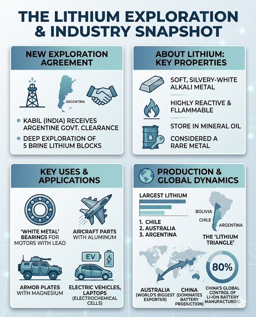 News: State-owned Khanij Bidesh India Limited (KABIL) has received environmental clearance from the Argentine govt for deep exploration of five brine lithium blocks.