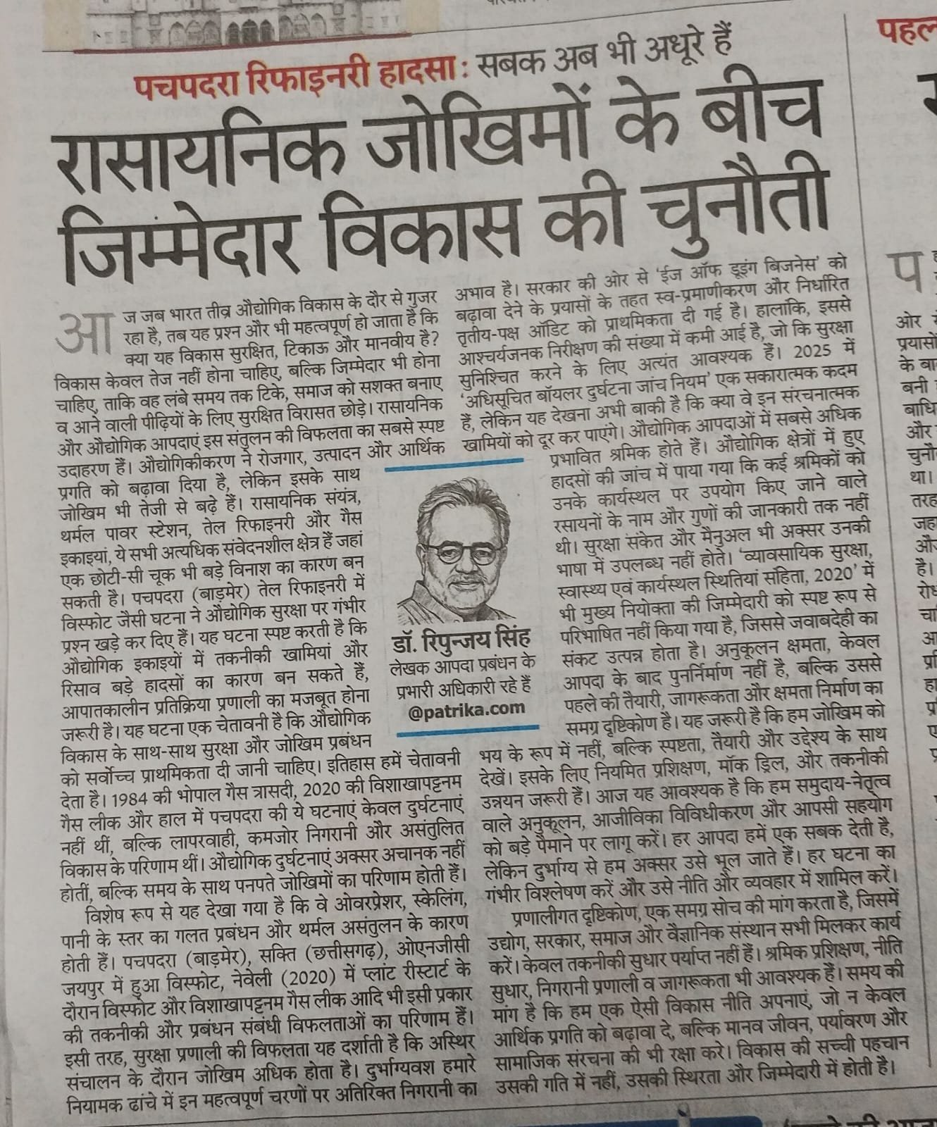 - भारत तीव्र औद्योगीकरण तथा आर्थिक प्रगति के दौर से गुजर रहा है। ऐसे समय में यह प्रश्न अत्यंत महत्त्वपूर्ण हो जाता है कि क्या यह विकास सुरक्षित, टिकाऊ और उत्तरदायी भी है? हाल के पचपदरा रिफाइनरी हादसे जैसे प्रसंग संकेत देते हैं कि केवल तीव्र गति से विकास पर्याप्त नहीं है, बल्कि औद्योगिक सुरक्षा, पर्यावरण संरक्षण तथा मानवीय उत्तरदायित्व भी उतने ही आवश्यक हैं।